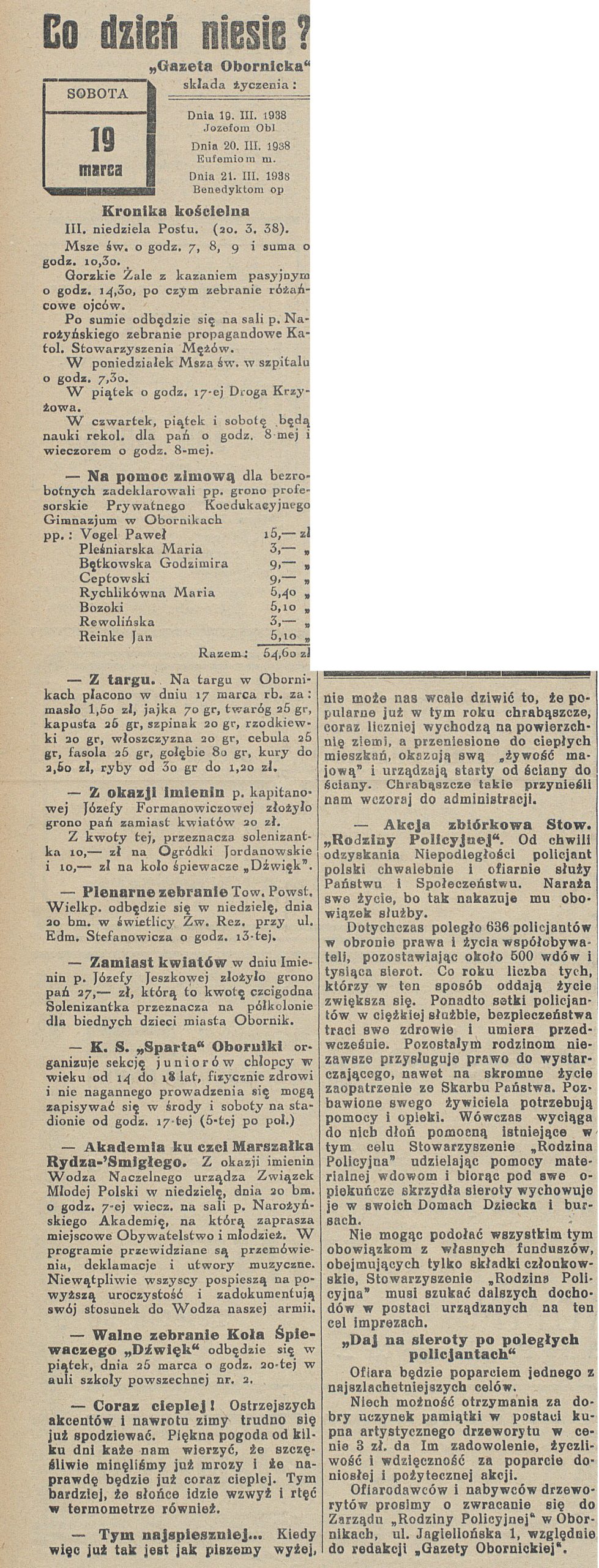 - 19 marca 1937 r. Starosta Obornicki wydał obwieszczenie w którym podał do publicznej wiadomości w porozumieniu z cechem rzeźnicko – wędliniarskim ceny mięsa. I tak słonina świeża kosztowała 1,7 zł, wątrobianka 1,8 zł, kiszka z bułek 0,8 zł, kaszanka cienki flak 0,8 zł. Ceny te odnosiły się do wszystkich punktów sprzedaży mięsa w powiecie obornickim.
