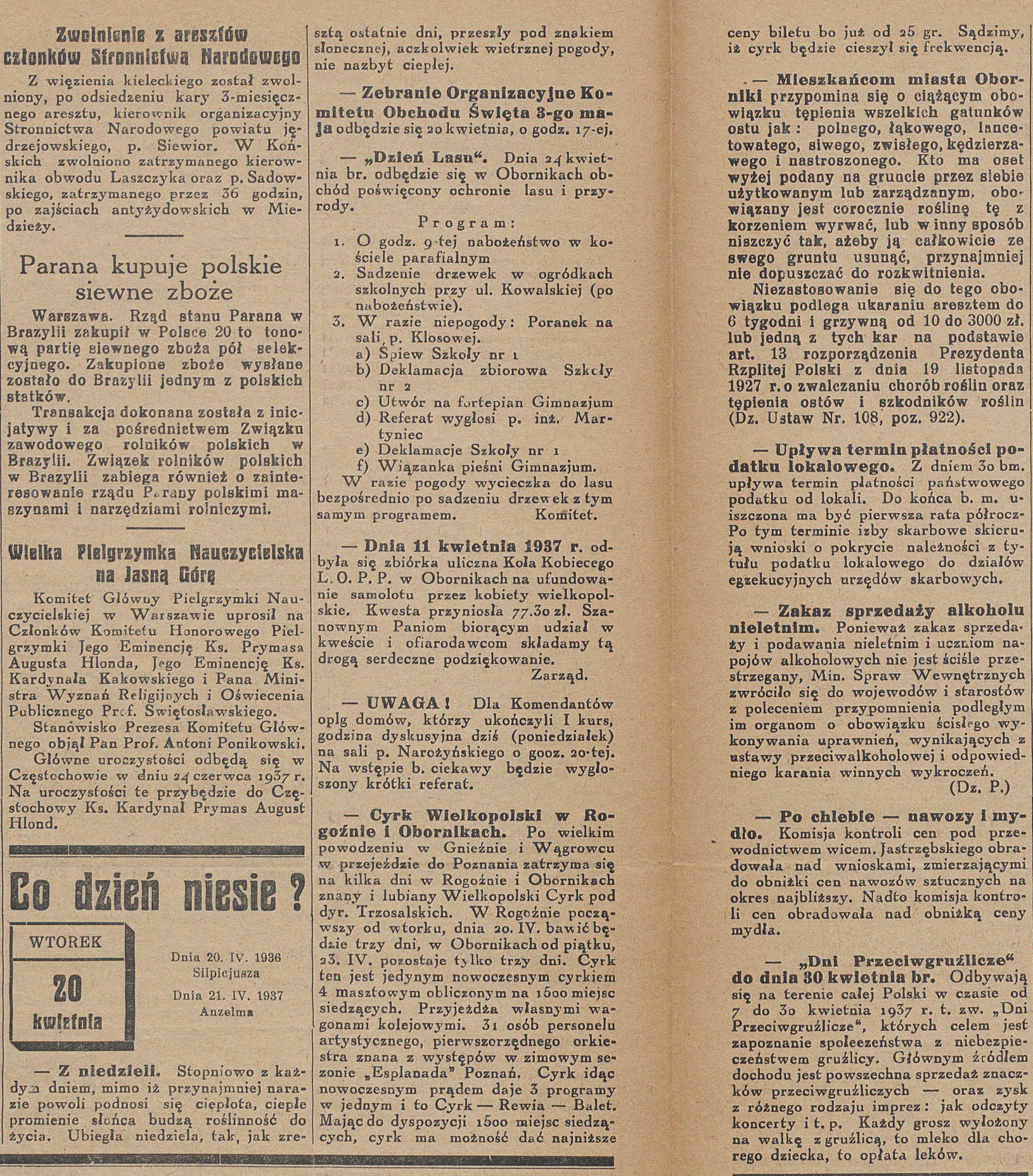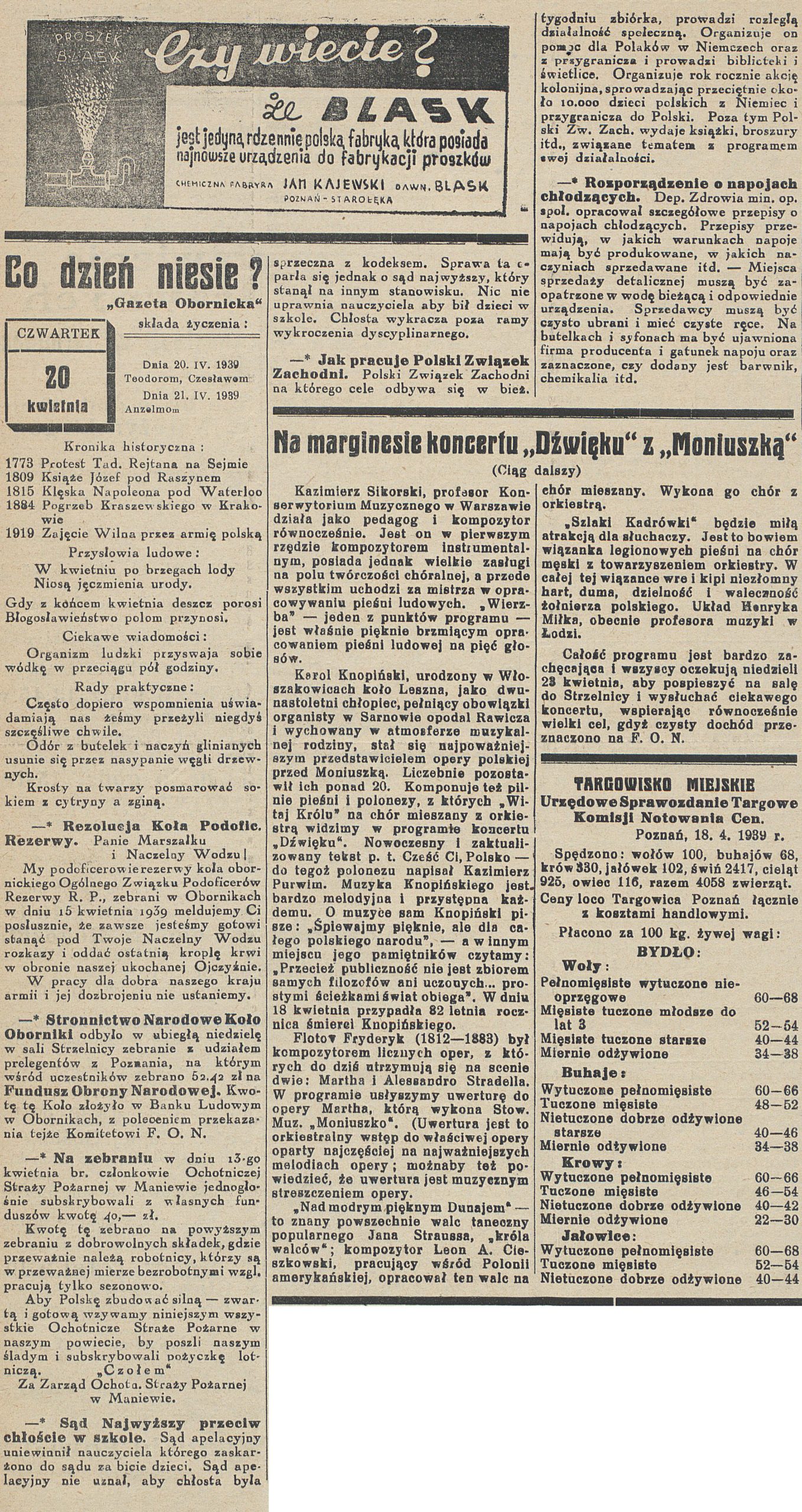 - 19 kwietnia 1939 r. odbyło się miesięczne zebranie obornickiego Oddziału Związku Strzeleckiego pod przewodnictwem pana Wojciechowskiego. Referat na temat obrony przeciwlotniczej wygłosił doktor Kruszka.