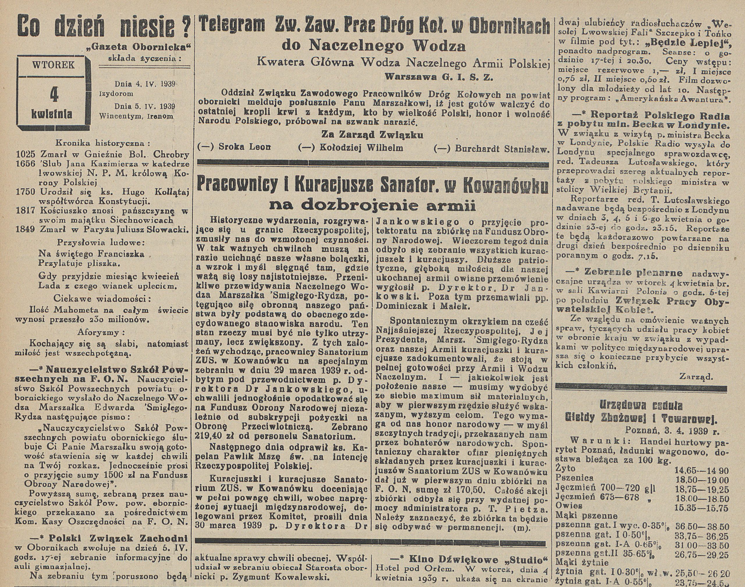 - 4 kwietnia 1938 r. odbyło się Nadzwyczajne Walne zebranie Towarzystwa Powstańców Wielkopolskich. Na zebraniu obecny był delegat zarządu z Poznania.