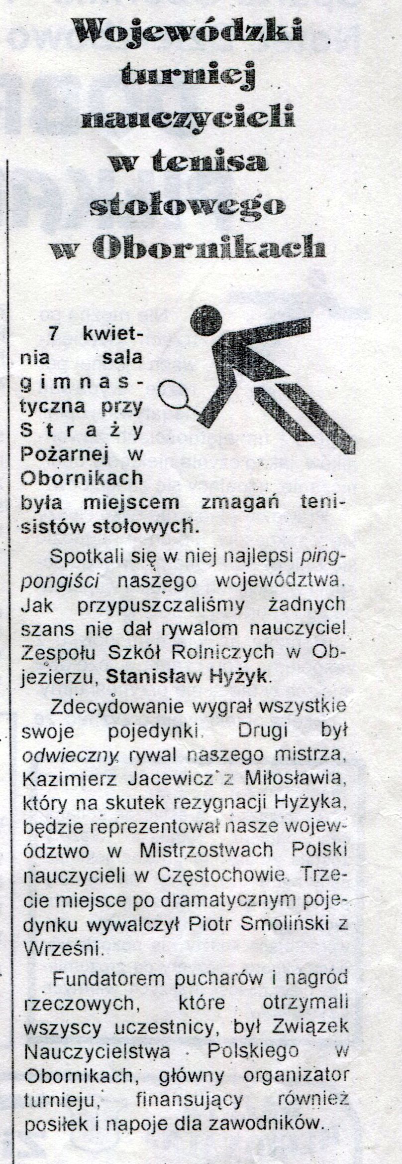 - 7 kwietnia 1994 r. w Sali gimnastycznej przy Straży Pożarnej odbyły się zawody w tenisie stołowym. Do obornik zjechali najlepsi tenisiści stołowi z Wielkopolski. Zwycięzcą zawodów został nauczyciel Zespołu Szkół w Objezierzu Stanisław Hyżyk.