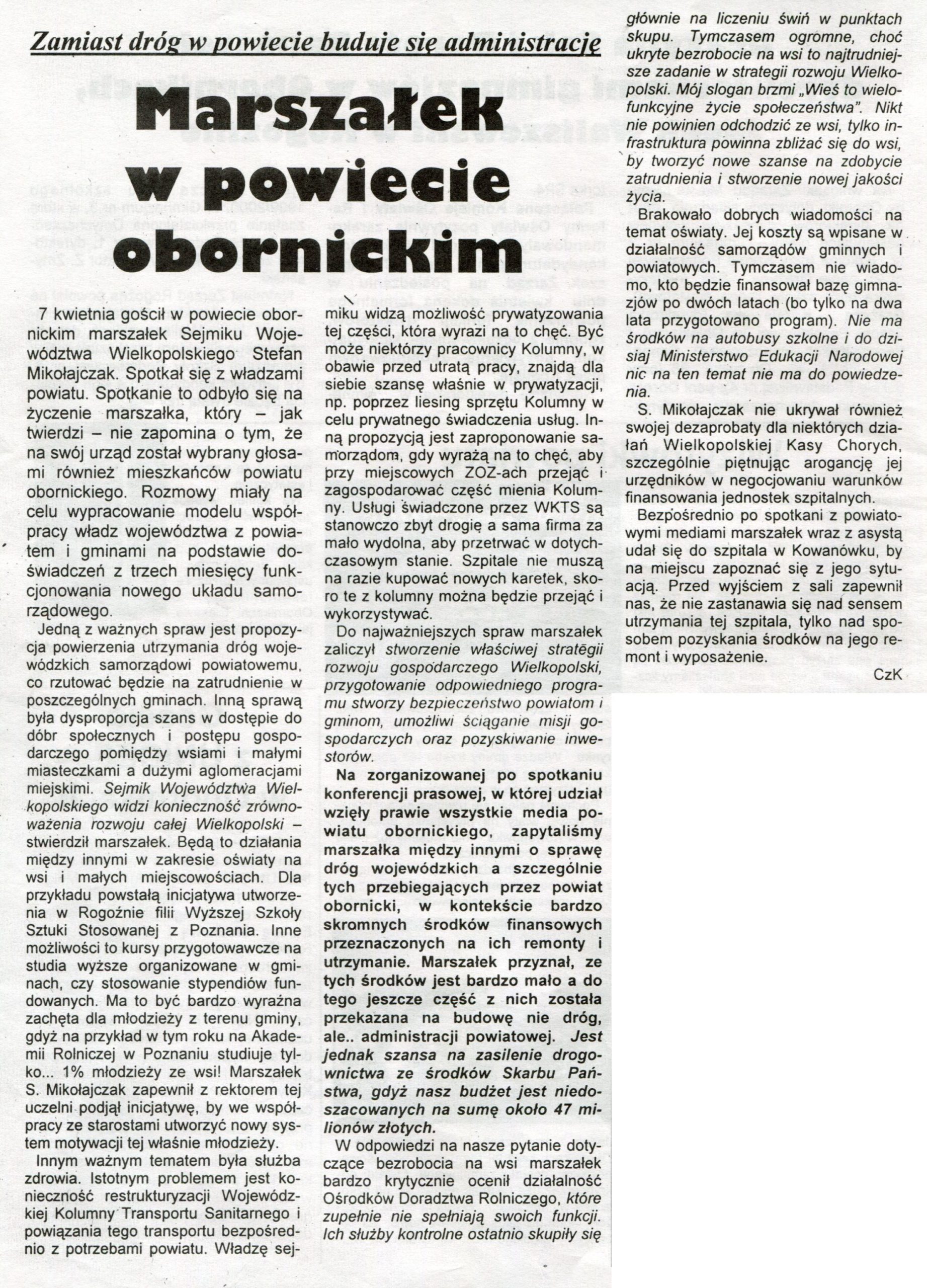 - 7 kwietnia 1999 r. w powiecie obornickim pojawił się z wizyta roboczą marszałek Sejmiku Województwa Wielkopolskiego Stefan Mikołajczak