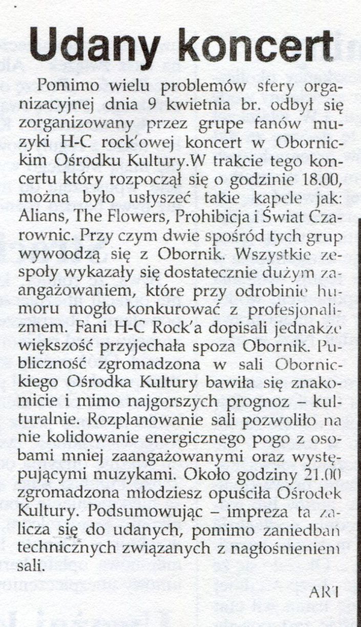- 9 kwietnia 1992 r. w Obornickim Ośrodku Kultury odbył się koncert rockowy podczas którego zagrały następujące zespoły: Alians, The Flowers, Prohibicja, Świat Czarownic.
